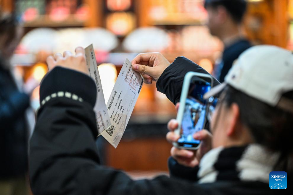 Audience take photos of tickets of Xiangsheng, or crosstalk comedy, at a tea house in north China's Tianjin, Dec. 4, 2025. Crosstalk comedy is a popular form of entertainment for citizens in Tianjin. (Xinhua/Zhao Zishuo)