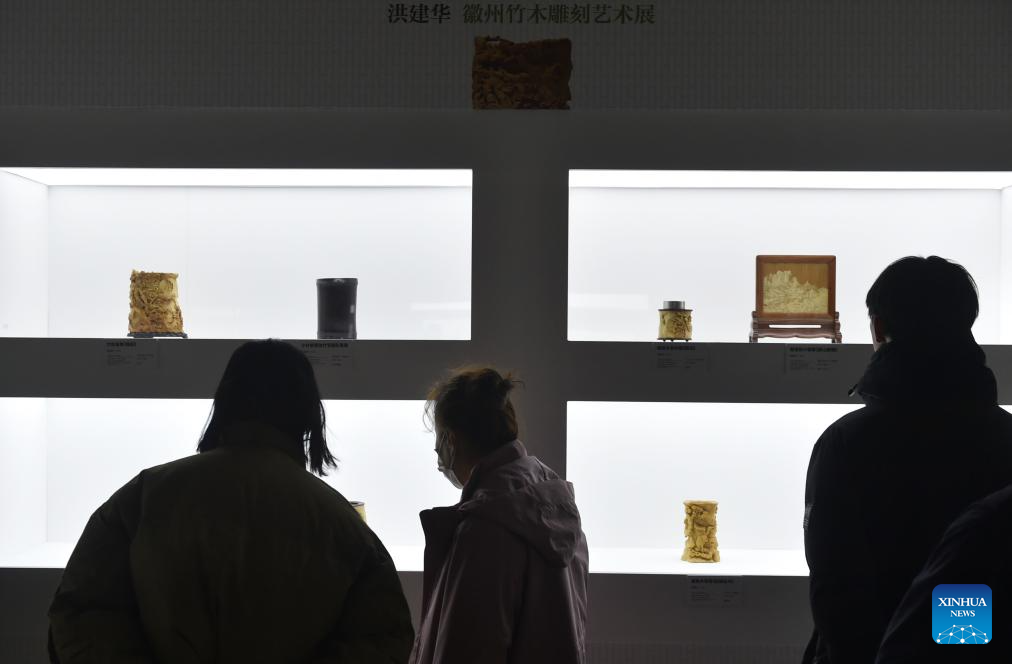 Visitors view exhibits during an exhibition titled "The Path of Mastery: Hong Jianhua's Bamboo and Wood Carving Art" at National Art Museum of China in Beijing, capital of China, Dec. 6, 2025. The exhibition featuring over 40 sets of artworks created by Hong Jianhua kicked off here on Friday. (Xinhua/Lu Peng)