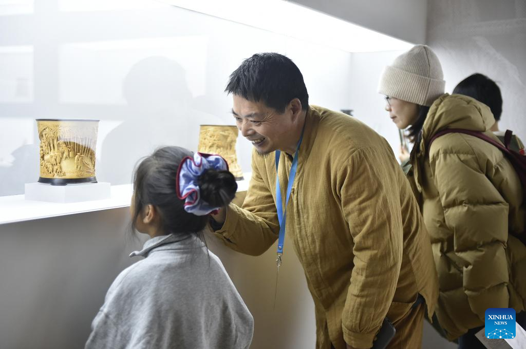 Hong Jianhua (2nd L) introduces his works displayed during an exhibition titled "The Path of Mastery: Hong Jianhua's Bamboo and Wood Carving Art" at National Art Museum of China in Beijing, capital of China, Dec. 6, 2025. The exhibition featuring over 40 sets of artworks created by Hong Jianhua kicked off here on Friday. (Xinhua/Lu Peng)