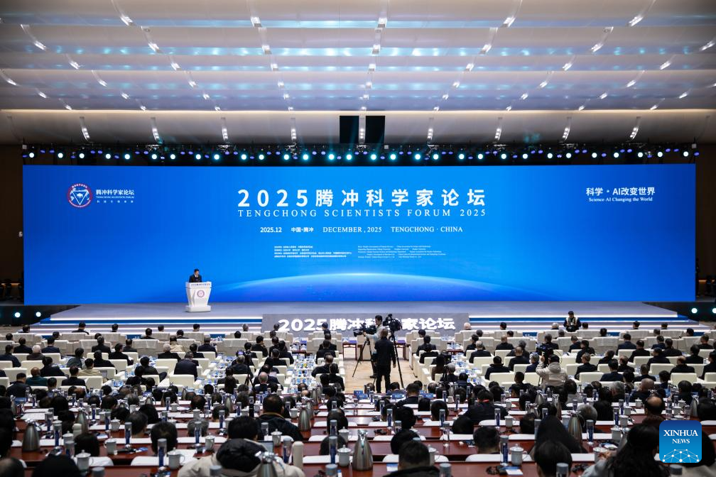 This photo shows the opening ceremony of Tengchong Scientists Forum 2025 in Tengchong City, southwest China's Yunnan Province, Dec. 6, 2025. The forum, attracting more than 120 academicians and over 70 presidents of well-known universities from home and abroad, opened here on Saturday. (Xinhua/Wang Anhaowei)