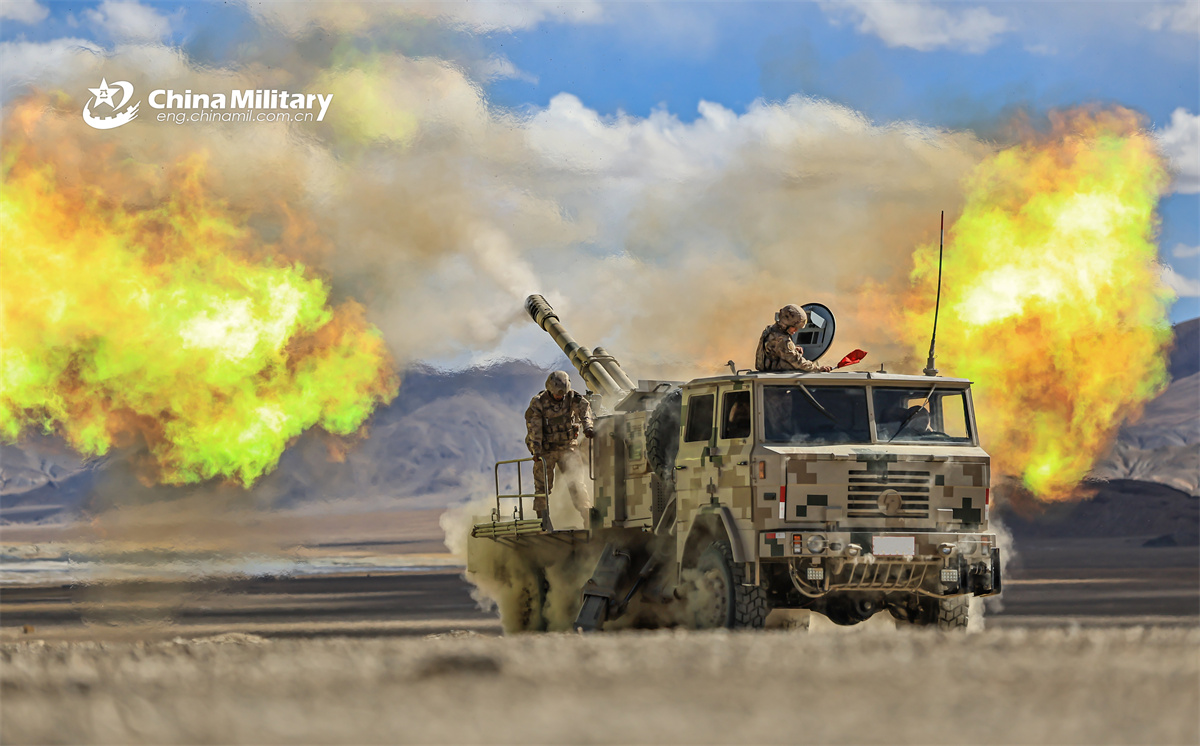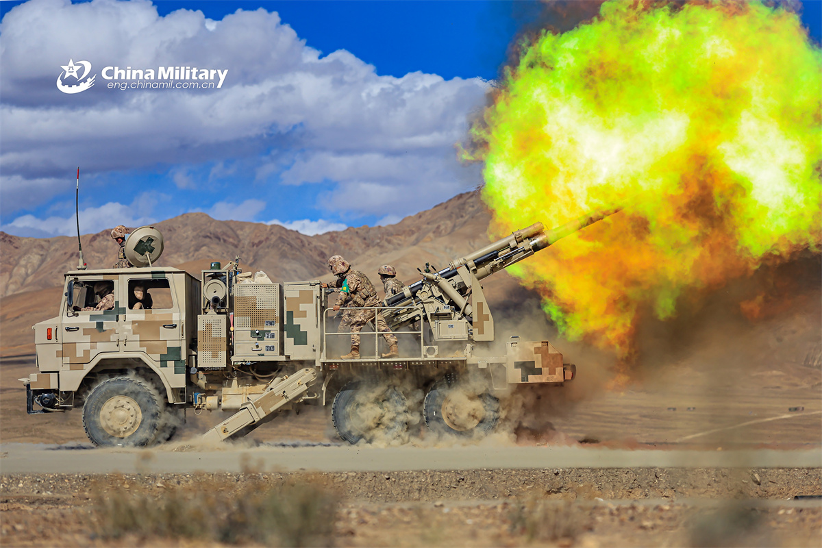 PCL-09 122mm self-propelled artillery (SPA) vehicle attached to an army unit under the Chinese PLA Xinjiang Military Command erupts in blinding flash at the mock targets during a live-fire training exercise. (eng.chinamil.com.cn/Photo by Qiang Chuxin)
