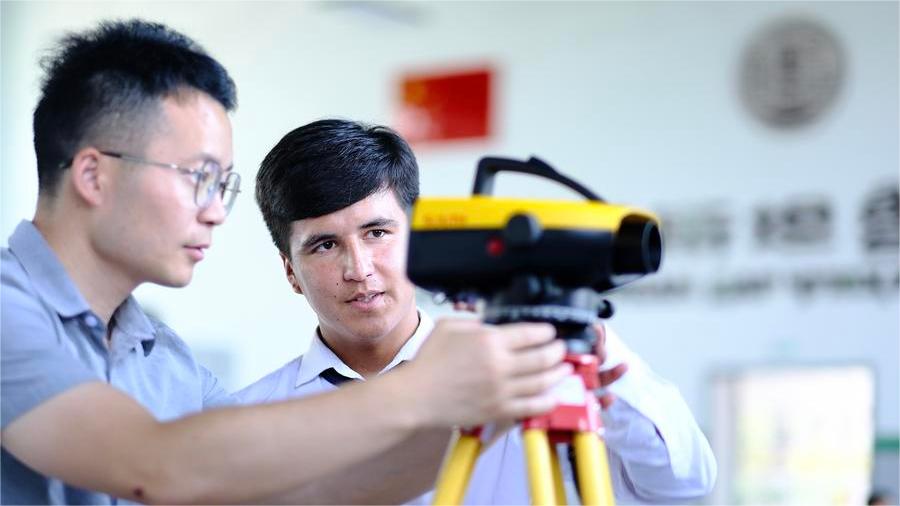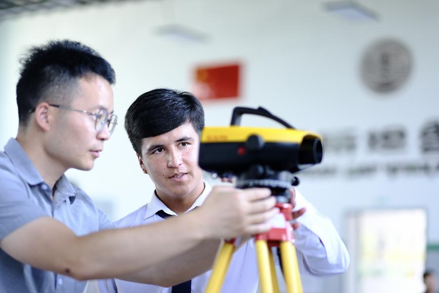 A teacher (L) from Tianjin Urban Construction Management & Vocation Technology College gives instructions to a student at the Luban Workshop in Dushanbe, Tajikistan, June 14, 2024. (Xinhua/Zheng Kaijun)