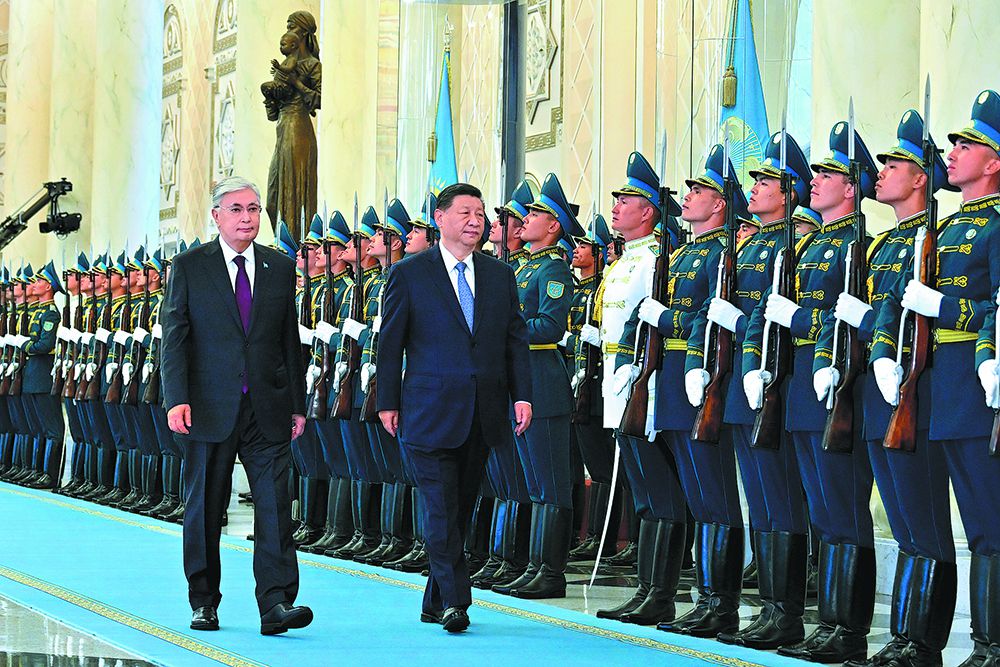 President Xi Jinping (center) reviews the honor guard, accompanied by Kazakh President Kassym-Jomart Tokayev, during a welcoming ceremony at the presidential palace in Astana on Wednesday. YUE YUEWEI/XINHUA