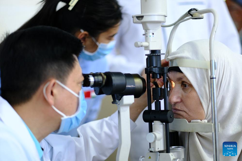 A patient receives examinations during a Lifeline Express International Sight Saving Mission event in Dushanbe, Tajikistan, June 12, 2024. More than 500 local cataract patients have received free surgeries under the program of Lifeline Express International Sight Saving Mission performed by Chinese medical team.…