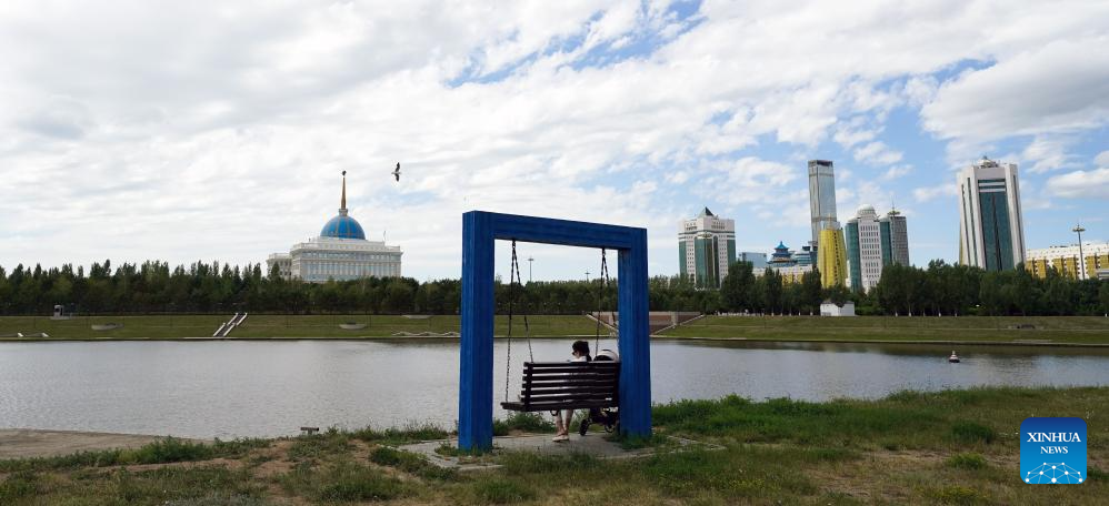 A woman enjoys leisure time by the Ishim River in Astana, Kazakhstan, June 30, 2024. (Xinhua/Wang Jianhua)