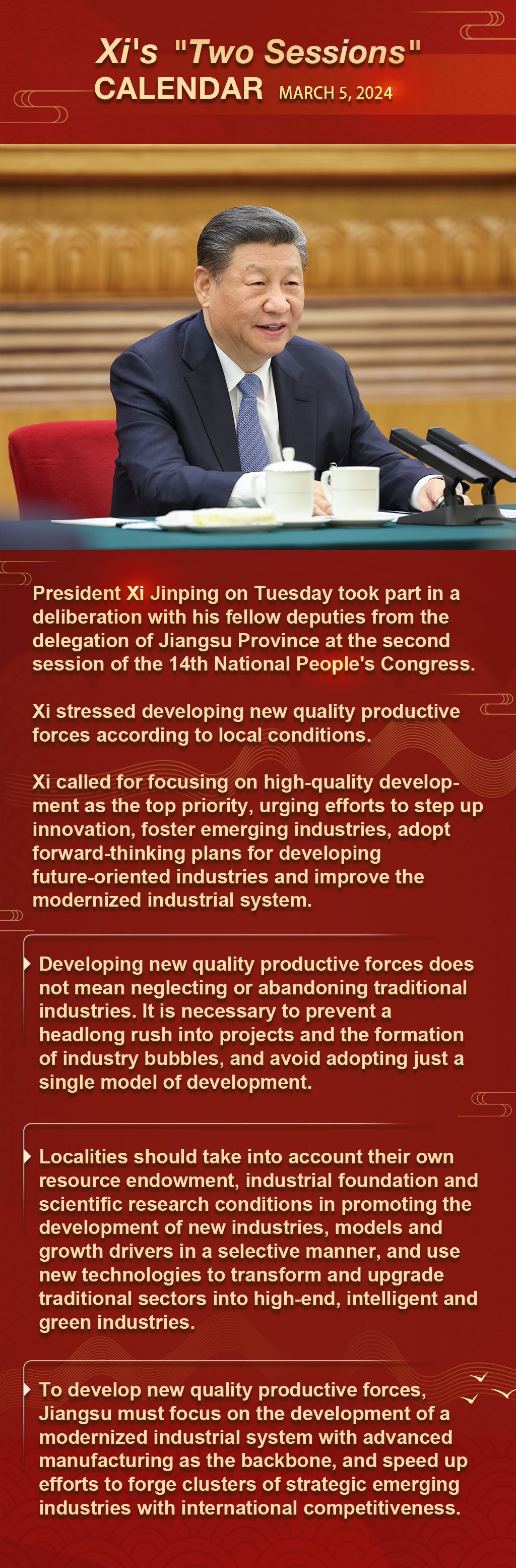 President Xi Jinping stressed developing new quality productive forces according to local conditions when he participated in a deliberation with fellow lawmakers from east China's Jiangsu Province on March 5.…