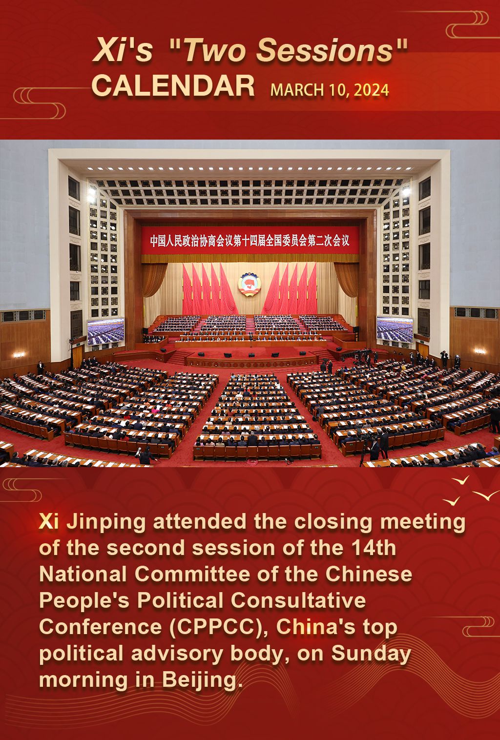 Chinese leaders Xi Jinping, Li Qiang, Zhao Leji, Cai Qi, Ding Xuexiang, Li Xi, and Han Zheng attend the closing meeting of the second session of the 14th National Committee of the Chinese People's Political Consultative Conference (CPPCC) at the Great Hall of the People in Beijing, capital of China, March 10, 2024. (Xinhua/Huang Jingwen)