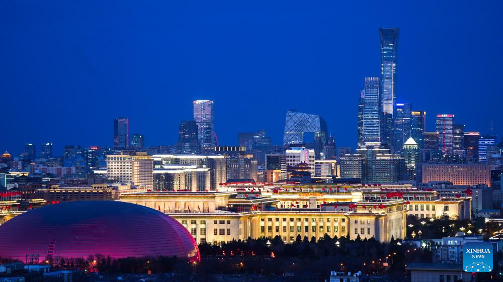 This photo taken on March 11, 2024 shows the Great Hall of the People nestled within architectural clusters in Beijing, capital of China. (Xinhua/Wang Jianhua)
