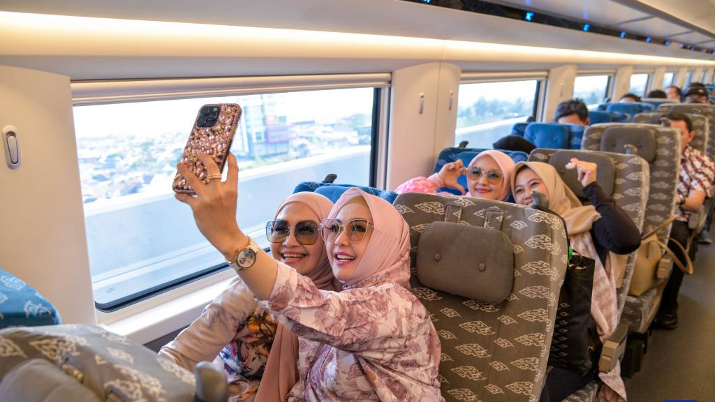 A family takes a selfie in front of a high-speed electric multiple unit train for the Jakarta-Bandung High-Speed Railway at Tegalluar Station in Bandung, Indonesia, Oct. 17, 2023.…