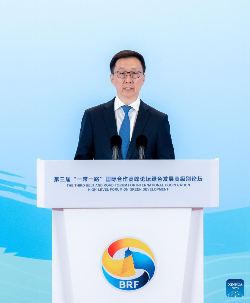 Chinese Vice President Han Zheng addresses the High-Level Forum on Green Development of the third Belt and Road Forum for International Cooperation in Beijing, capital of China, Oct. 18, 2023.…