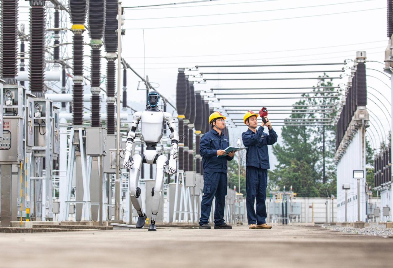 Maintenance staff and a smart robot inspect power transformation equipment at a transformer station in Huangshi, central China's Hubei province. (Photo/Zhou Wei)