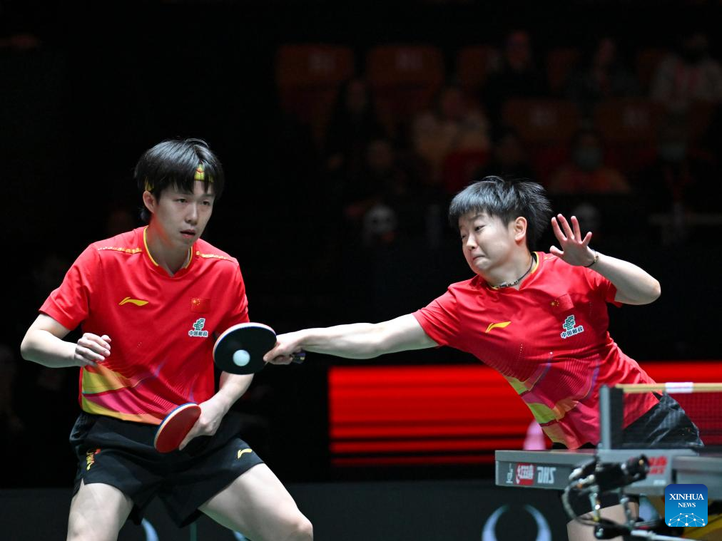 Wang Chuqin (L)/Sun Yingsha of China compete in the mixed doubles match against Alexis Lebrun/Yuan Jia Nan of France during the stage 2 group match between China and France at the ITTF Mixed Team World Cup 2025 in Chengdu, southwest China's Sichuan Province, Dec. 4, 2025. (Xinhua/Xu Bingjie)