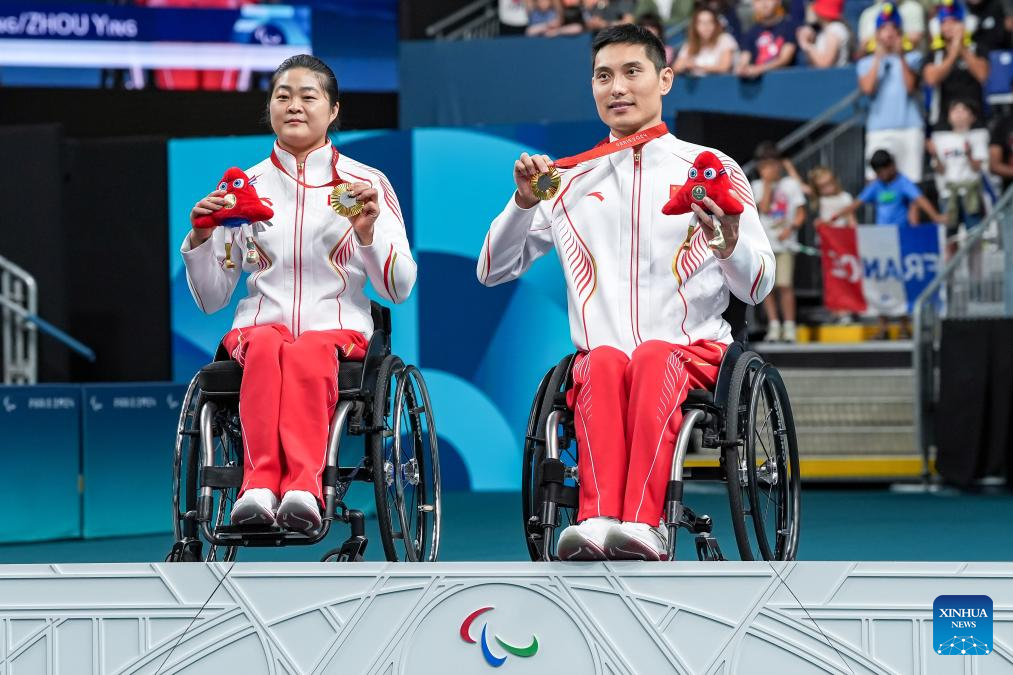 Gold medalists Feng Panfeng (R)/Zhou Ying of China pose during the awarding ceremony for the Para Table Tennis Mixed Doubles XD7 event at the Paris 2024 Paralympic Games in Paris, France, Sept. 1, 2024.…