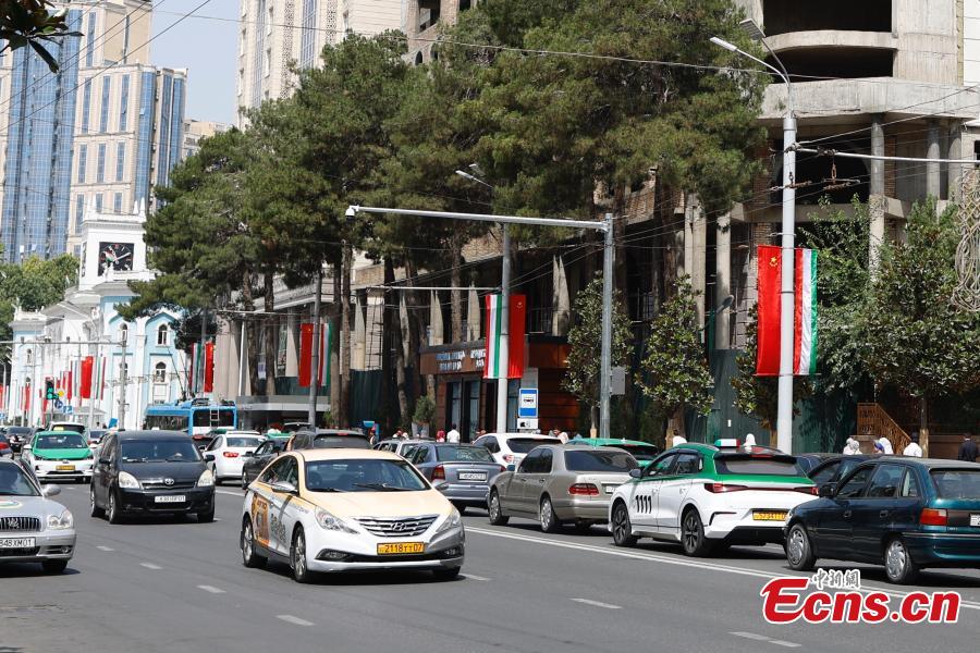 Flags of China and Tajikistan flutter in Dushanbe, capital of Tajikistan, on July 4, 2024, to welcome the visit of Chinese President Xi Jinping. (Photo: China News Service / Han Haidan)